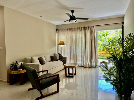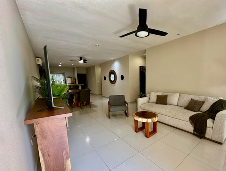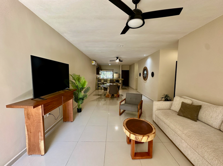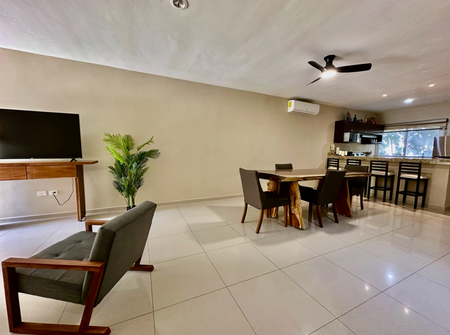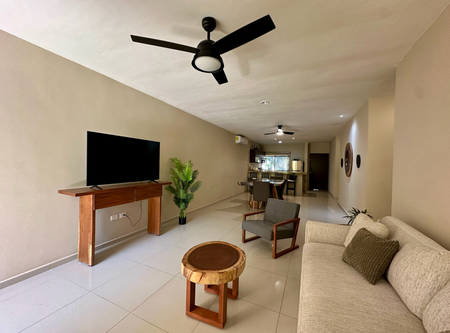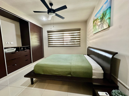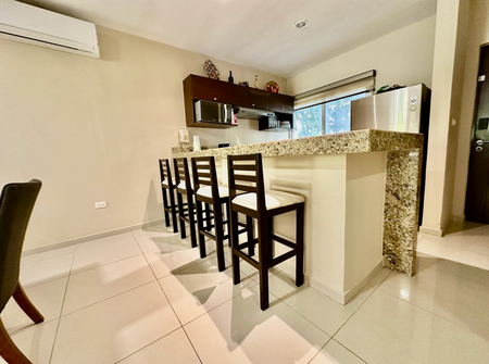 Este amplio de dos recámaras y dos baños y medio, cocina integral completamente equipada con todo lo que necesites para disfrutar del lugar. En las áreas comunes hay una alberca, camastros, dos bañeras con hidro-masaje, gimnasio, salón de juego para niños, salón de juegos con mesa de billar, mesa de hockey, y mesa de póker. Hay otras áreas de entrenamiento situadas alrededor de los jardines hermosamente diseñados. También incluye un lugar de estacionamiento subterráneo.